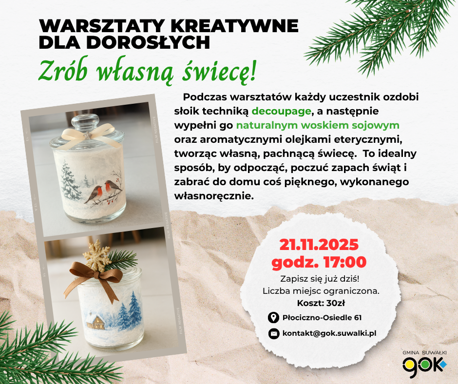 Serdecznie zapraszamy na warsztaty kreatywne dla dorosłych. Podczas warsztatów każdy uczestnik ozdobi słoik techniką decoupage, a następnie wypełni go naturalnym woskiem sojowym oraz aromatycznymi olejkami eterycznymi, tworząc własną, pachnącą świecę. To idealny sposób, by odpocząć, poczuć zapach świąt i zabrać do domu coś pięknego, wykonanego własnoręcznie. Własnoręcznie wykonana świeca może być idealnym pomysłem na prezent. […]