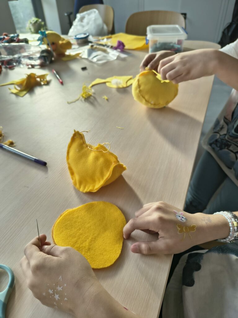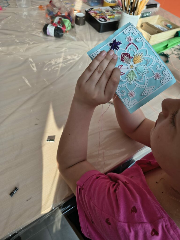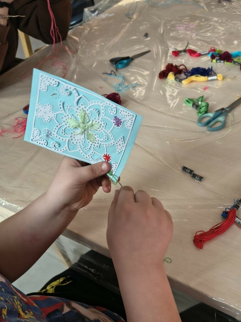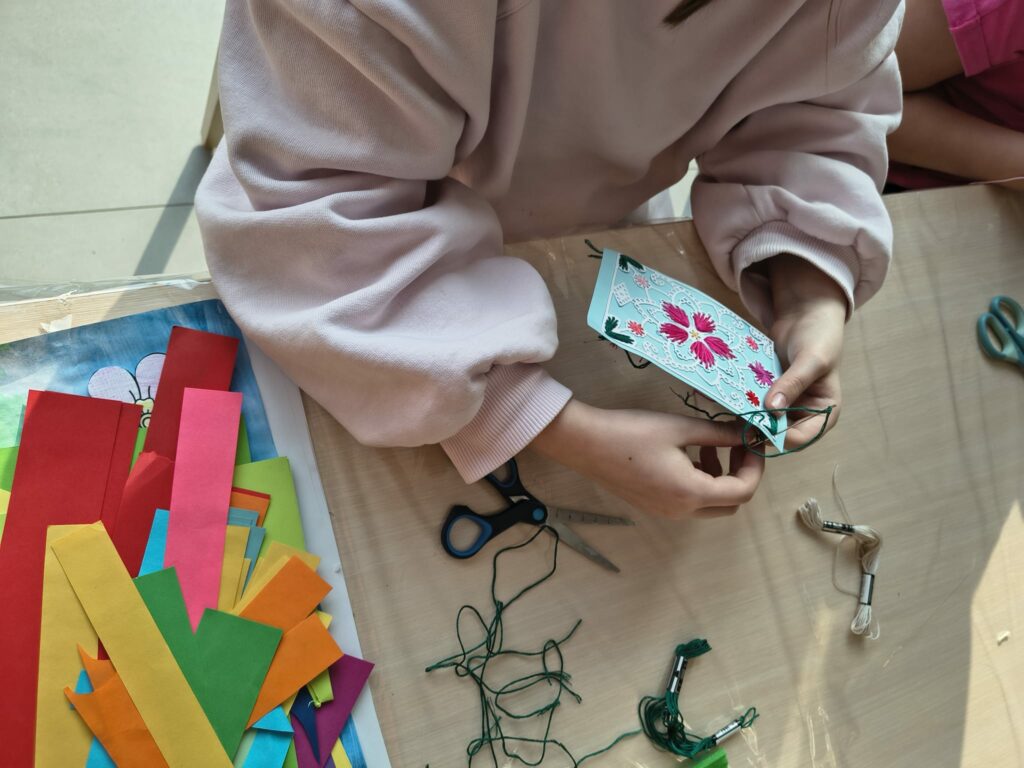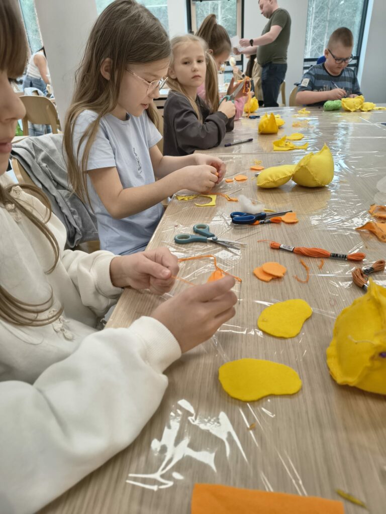 Marcowe zajęcia w Pracowni dla dzieci były pełne nowych wyzwań i twórczej zabawy. Uczestnicy rozpoczęli swoją przygodę z szyciem, stawiając pierwsze kroki w pracy z igłą i nitką. Podczas zajęć dzieci uczyły się podstawowych ściegów, rozwijały cierpliwość oraz zdolności manualne, a efektem ich pracy były dekoracyjne obrazki z motywem kwiatowym, które samodzielnie wyszywały.