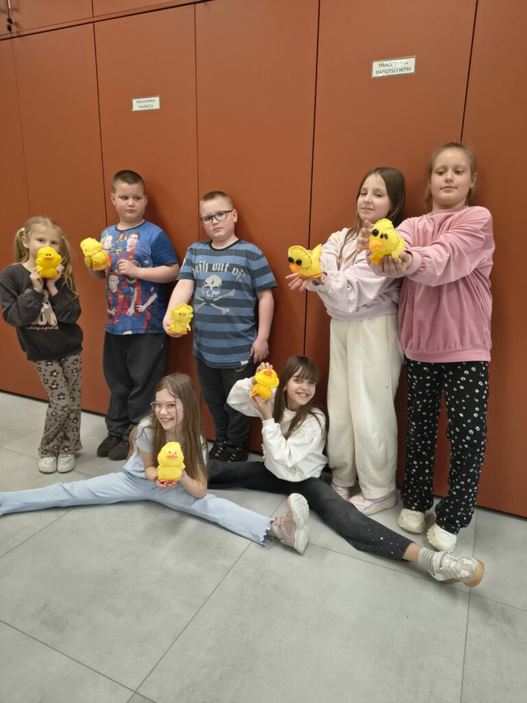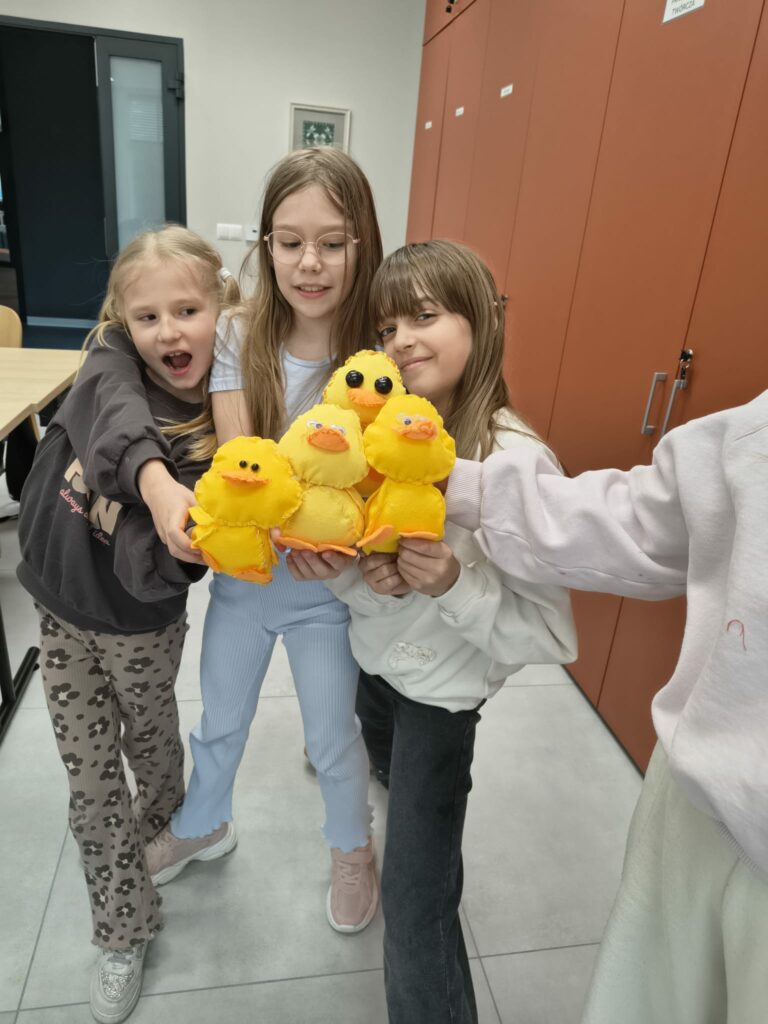 W drugiej połowie miesiąca, wraz ze zbliżającymi się Świętami Wielkanocnymi, zajęcia nabrały świątecznego charakteru. Dzieci własnoręcznie uszyły z filcu urocze żółte kaczuszki, które stały się piękną, wiosenną ozdobą .