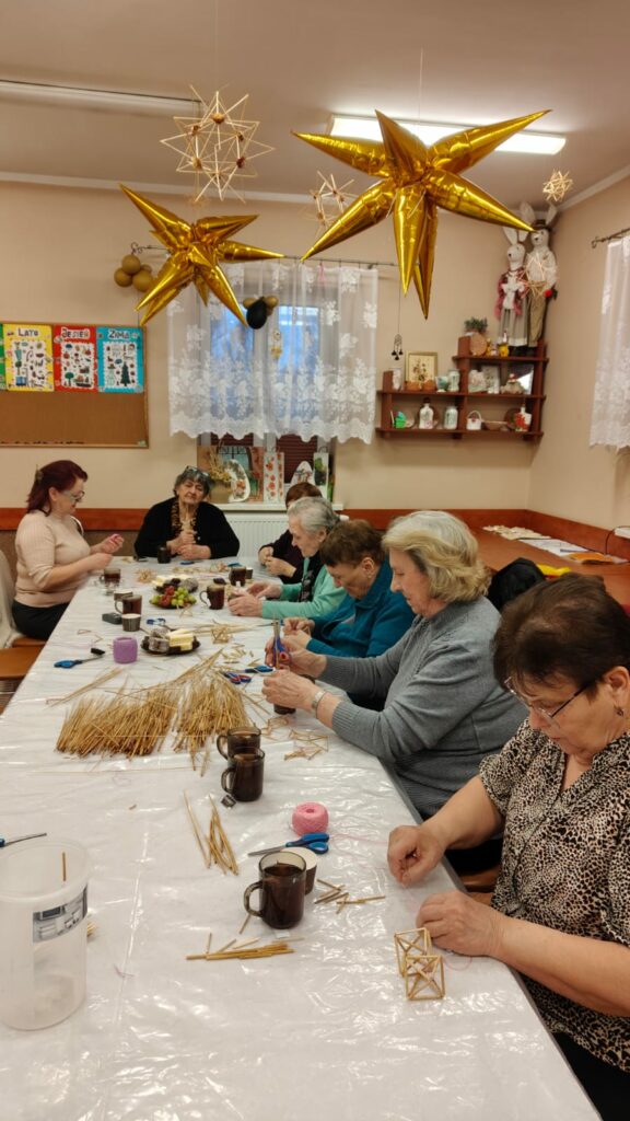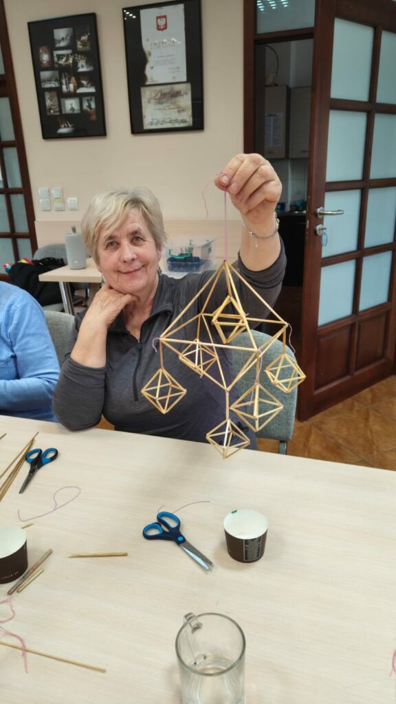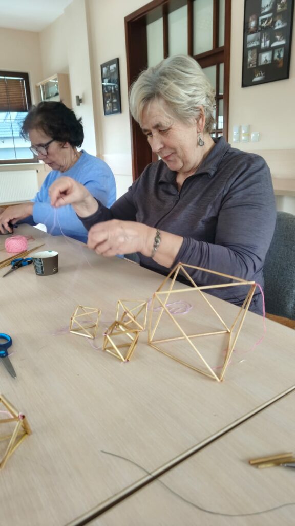 Podczas zajęć uczestnicy mieli okazję samodzielnie stworzyć własne pająki z wykorzystaniem słomy, bibuły i nici. Praca wymagała cierpliwości i precyzji, ale przyniosła wiele satysfakcji i radości. Wspólne tworzenie sprzyjało rozmowom, integracji oraz wymianie wspomnień związanych z dawnymi tradycjami.