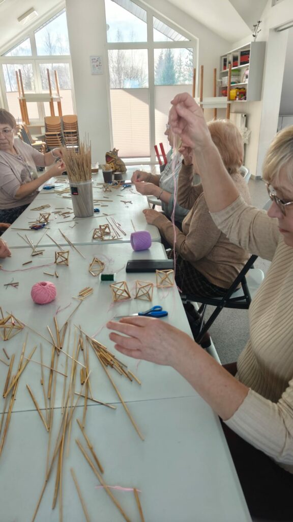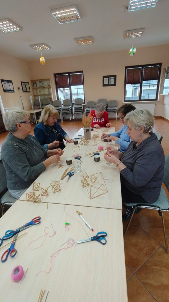 Warsztaty plastyczne dla seniorów, które odbywają się regularnie w świetlicach, tym razem poświęcone były wyjątkowej tradycji tworzenia „pająków wielkanocnych”. Pająki ze słomy to tradycyjne ozdoby ludowe, które niegdyś zawieszano pod sufitem w wiejskich domach, szczególnie w okresie świątecznym. Wierzono, że przynoszą szczęście, chronią domowników i zapewniają pomyślność. Ich lekkie, geometryczne konstrukcje zdobione były kolorowymi elementami, co nadawało wnętrzom wyjątkowy, świąteczny charakter.