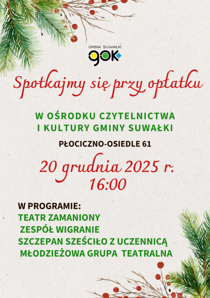 Zapraszamy wszystkich mieszkańców Gminy Suwałki na spotkanie opłatkowe w Ośrodku Czytelnictwa i Kultury Gminy Suwałki w Płocicznie-Osiedlu. Przyjdźcie z rodziną, przynieście ze sobą mały poczęstunek i zasiądźmy razem do stołu. Niech połączy nas wspólne kolędowanie.